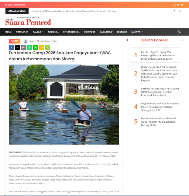 Fun Motour Camp 2026 Satukan Paguyuban HWBC dalam Kebersamaan dan Sinergi by masmul 4 Maret 2026 in Silahkan kunjungi https://www.suarapemredkalbar.com/read/potret/04032026/fun-motour-camp-2026-satukan-paguyuban-hwbc-dalam-kebersamaan-dan-sinergi. You Might Like Regional Public Launching New ADV160 The SUV Pride Grand Launching New PCX 160 Truly Exceptional! Tetap hati-hati ya bro sist berkendara saat hujan.