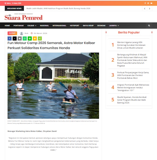 Fun Motour Camp 2026 Semarak, Astra Motor Kalbar Perkuat Solidaritas Komunitas Honda by masmul 6 Maret 2026 in Silahkan kunjungi https://www.suarapemredkalbar.com/read/potret/06032026/fun-motour-camp-2026-semarak-astra-motor-kalbar-perkuat-solidaritas-komunitas-honda. You Might Like Regional Public Launching New ADV160 The SUV Pride Grand Launching New PCX 160 Truly Exceptional! Tetap hati-hati ya bro sist berkendara saat hujan.