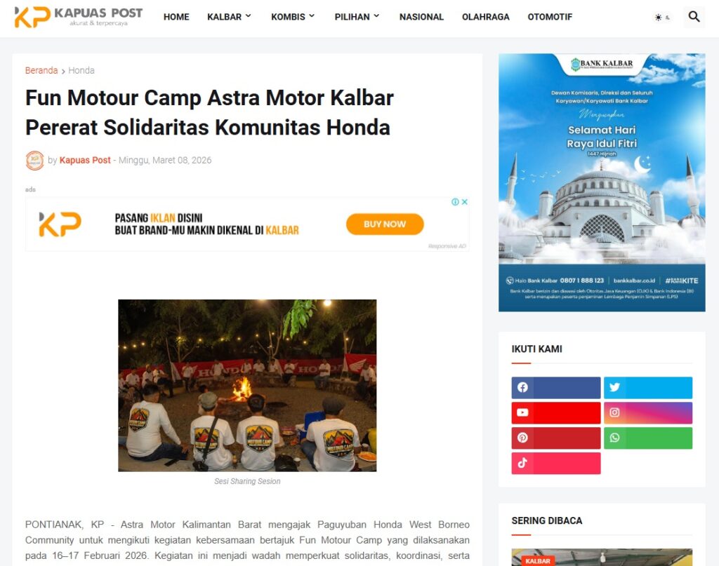 Fun Motour Camp Astra Motor Kalbar Pererat Solidaritas Komunitas Honda by Muhammad Arif 8 Maret 2026 in Silahkan kunjungi https://www.kapuaspost.web.id/2026/03/fun-motour-camp-astra-motor-kalbar.html. Tags: astra Astra Motor kalbar Astra Motor Pontianak astramotor honda kalbar pontianak sepeda motor You Might Like Regional Public Launching New ADV160 The SUV Pride Grand Launching New PCX 160 Truly Exceptional! Tetap hati-hati ya bro sist berkendara saat hujan.