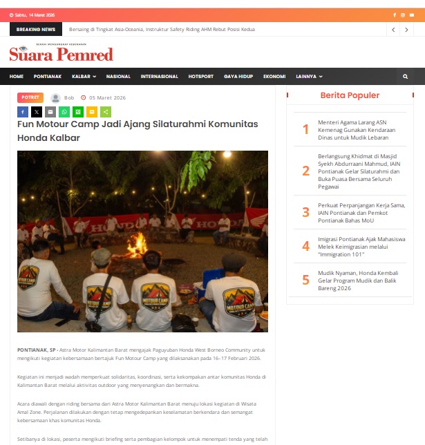 Fun Motour Camp Jadi Ajang Silaturahmi Komunitas Honda Kalbar by masmul 5 Maret 2026 in Silahkan kunjungi https://www.suarapemredkalbar.com/read/potret/05032026/fun-motour-camp-jadi-ajang-silaturahmi-komunitas-honda-kalbar. You Might Like Regional Public Launching New ADV160 The SUV Pride Grand Launching New PCX 160 Truly Exceptional! Tetap hati-hati ya bro sist berkendara saat hujan.