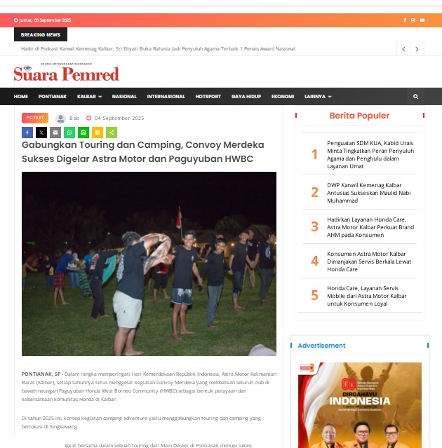 Gabungkan Touring dan Camping, Convoy Merdeka Sukses Digelar Astra Motor dan Paguyuban HWBC by masmul 4 September 2025 in Silahkan kunjungi https://www.suarapemredkalbar.com/read/potret/04092025/gabungkan-touring-dan-camping-convoy-merdeka-sukses-digelar-astra-motor-dan-paguyuban-hwbc. You Might Like Regional Public Launching New ADV160 The SUV Pride Grand Launching New PCX 160 Truly Exceptional! Tetap hati-hati ya bro sist berkendara saat hujan.