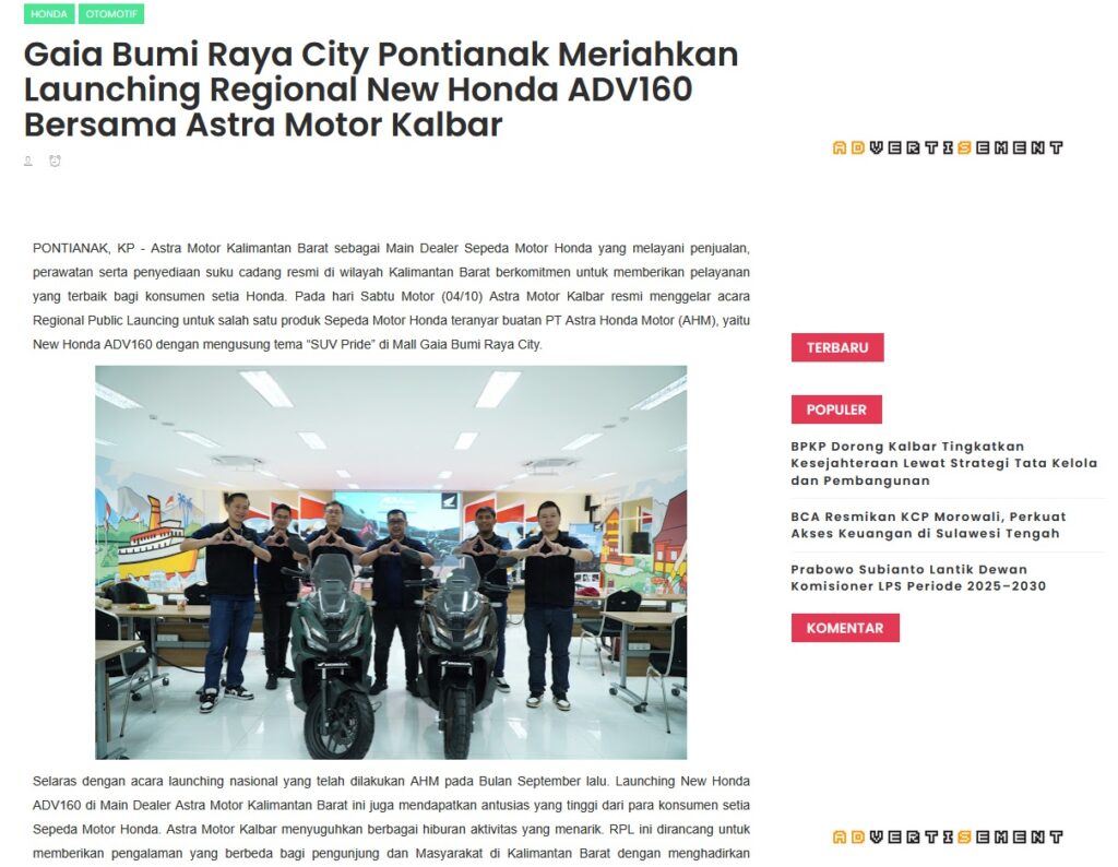 Gaia Bumi Raya City Pontianak Meriahkan Launching Regional New Honda ADV160 Bersama Astra Motor Kalbar by Muhammad Arif 10 Oktober 2025 in Silahkan kunjungi https://www.kapuaspost.web.id/2025/10/gaia-bumi-raya-city-pontianak-meriahkan.html. Tags: astra Astra Motor kalbar Astra Motor Pontianak astramotor honda kalbar pontianak sepeda motor You Might Like Regional Public Launching New ADV160 The SUV Pride Grand Launching New PCX 160 Truly Exceptional! Tetap hati-hati ya bro sist berkendara saat hujan.