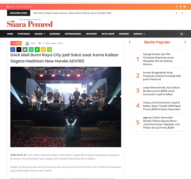 GAIA Mall Bumi Raya City jadi Saksi saat Asmo Kalbar Segera Hadirkan New Honda ADV160 by masmul 11 November 2025 in Silahkan kunjungi https://www.suarapemredkalbar.com/read/potret/11112025/gaia-mall-bumi-raya-city-jadi-saksi-saat-asmo-kalbar-segera-hadirkan-new-honda-adv160. You Might Like Regional Public Launching New ADV160 The SUV Pride Grand Launching New PCX 160 Truly Exceptional! Tetap hati-hati ya bro sist berkendara saat hujan.