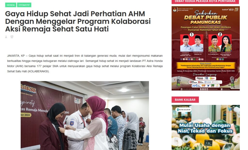 Gaya Hidup Sehat Jadi Perhatian AHM Dengan Menggelar Program Kolaborasi Aksi Remaja Sehat Satu Hati by Muhammad Arif 9 November 2024 in Silahkan kunjungi https://www.kapuaspost.web.id/2024/11/gaya-hidup-sehat-jadi-perhatian-ahm.html. Tags: astra Astra Motor kalbar Astra Motor Pontianak astramotor honda kalbar pontianak sepeda motor You Might Like Regional Public Launching New ADV160 The SUV Pride Grand Launching New PCX 160 Truly Exceptional! Tetap hati-hati ya bro sist berkendara saat hujan.