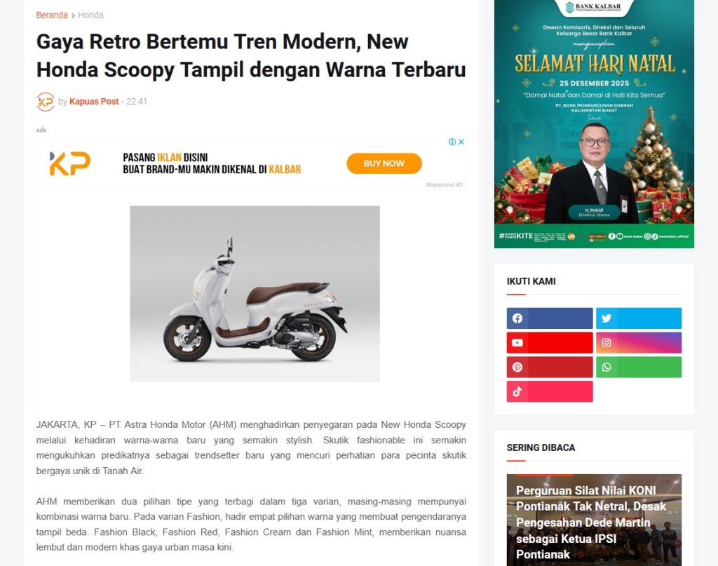 Gaya Retro Bertemu Tren Modern, New Honda Scoopy Tampil dengan Warna Terbaru by Muhammad Arif 27 Desember 2025 in Silahkan kunjungi https://www.kapuaspost.web.id/2025/12/gaya-retro-bertemu-tren-modern-new.html. Tags: astra Astra Motor kalbar Astra Motor Pontianak astramotor honda kalbar pontianak sepeda motor You Might Like Regional Public Launching New ADV160 The SUV Pride Grand Launching New PCX 160 Truly Exceptional! Tetap hati-hati ya bro sist berkendara saat hujan.
