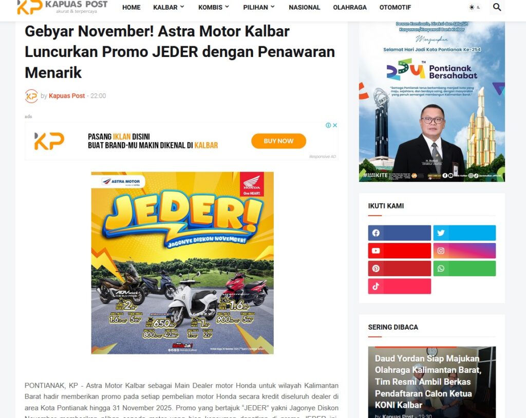 Gebyar November! Astra Motor Kalbar Luncurkan Promo JEDER dengan Penawaran Menarik by Muhammad Arif 15 November 2025 in Silahkan kunjungi https://www.kapuaspost.web.id/2025/11/gebyar-november-astra-motor-kalbar.html. Tags: astra Astra Motor kalbar Astra Motor Pontianak astramotor honda kalbar pontianak sepeda motor You Might Like Regional Public Launching New ADV160 The SUV Pride Grand Launching New PCX 160 Truly Exceptional! Tetap hati-hati ya bro sist berkendara saat hujan.
