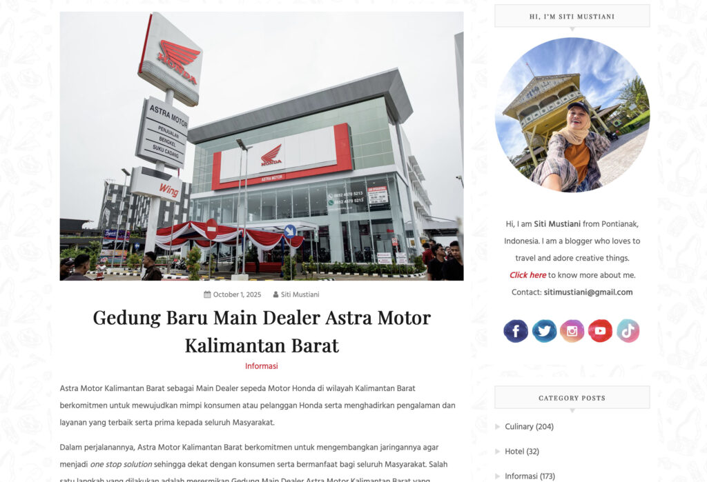 Gedung Baru Main Dealer Astra Motor Kalimantan Barat by Siti Mustiani 10 Oktober 2025 in Silahkan kunjungi https://sitimustiani.com/2025/10/gedung-baru-main-dealer-astra-motor-kalimantan-barat/. Tags: Astra Motor Kalimantan Barat Gedung Baru Honda Kalbar Main Dealer Main Dealer Astra Motor Naek Honda jak Siti Mustiani http://www.sitimustiani.com Love to travel and adore creative things ✨ You Might Like Regional Public Launching New ADV160 The SUV Pride Grand Launching New PCX 160 Truly Exceptional! Tetap hati-hati ya bro sist berkendara saat hujan.