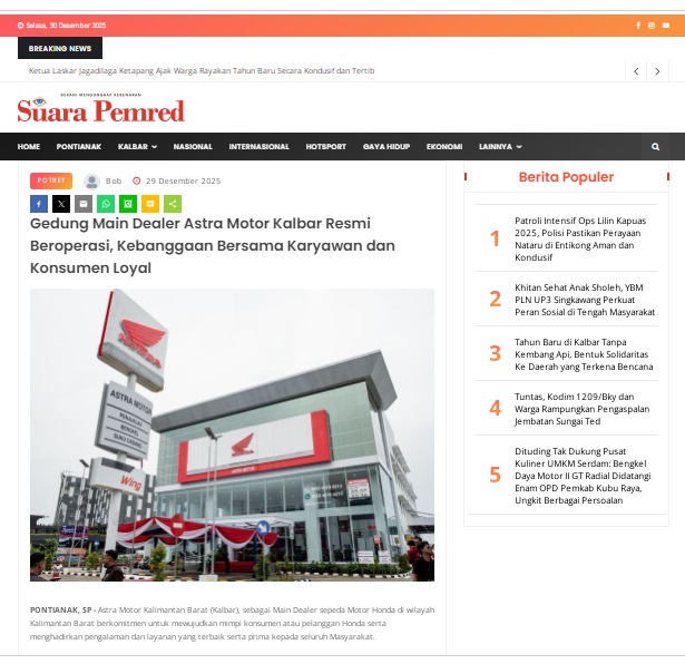 Gedung Main Dealer Astra Motor Kalbar Resmi Beroperasi, Kebanggaan Bersama Karyawan dan Konsumen Loyal by masmul 29 Desember 2025 in Silahkan kunjungi https://www.suarapemredkalbar.com/read/potret/29122025/gedung-main-dealer-astra-motor-kalbar-resmi-beroperasi-kebanggaan-bersama-karyawan-dan-konsumen-loyal. You Might Like Regional Public Launching New ADV160 The SUV Pride Grand Launching New PCX 160 Truly Exceptional! Tetap hati-hati ya bro sist berkendara saat hujan.