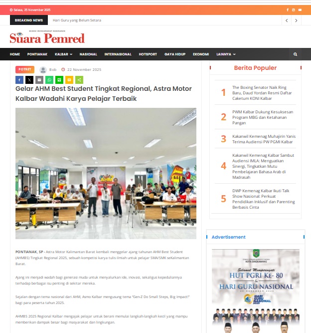 Gelar AHM Best Student Tingkat Regional, Astra Motor Kalbar Wadahi Karya Pelajar Terbaik by masmul 22 November 2025 in Silahkan kunjungi https://www.suarapemredkalbar.com/read/potret/22112025/gelar-ahm-best-student-tingkat-regional-astra-motor-kalbar-wadahi-karya-pelajar-terbaik. You Might Like Regional Public Launching New ADV160 The SUV Pride Grand Launching New PCX 160 Truly Exceptional! Tetap hati-hati ya bro sist berkendara saat hujan.