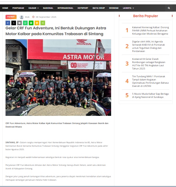 Gelar CRF Fun Adventure, Ini Bentuk Dukungan Astra Motor Kalbar pada Komunitas Trabasan di Sintang by masmul 8 September 2025 in Silahkan kunjungi https://www.suarapemredkalbar.com/read/potret/08092025/gelar-crf-fun-adventure-ini-bentuk-dukungan-astra-motor-kalbar-pada-komunitas-trabasan-di-sintang. You Might Like Regional Public Launching New ADV160 The SUV Pride Grand Launching New PCX 160 Truly Exceptional! Tetap hati-hati ya bro sist berkendara saat hujan.