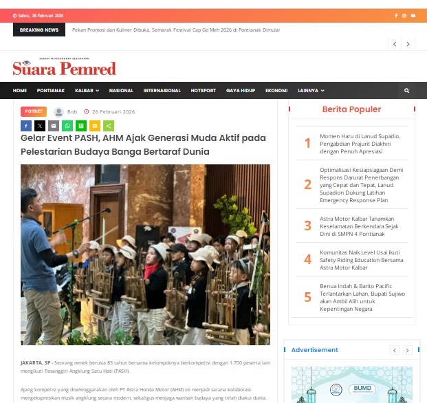 Gelar Event PASH, AHM Ajak Generasi Muda Aktif pada Pelestarian Budaya Banga Bertaraf Dunia by masmul 26 Februari 2026 in Silahkan kunjungi https://www.suarapemredkalbar.com/read/potret/26022026/gelar-event-pash-ahm-ajak-generasi-muda-aktif-pada-pelestarian-budaya-banga-bertaraf-dunia. You Might Like Regional Public Launching New ADV160 The SUV Pride Grand Launching New PCX 160 Truly Exceptional! Tetap hati-hati ya bro sist berkendara saat hujan.