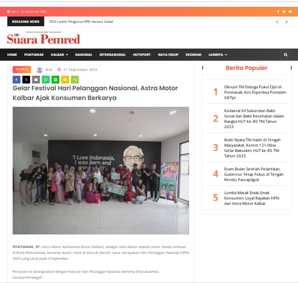 Gelar Festival Hari Pelanggan Nasional, Astra Motor Kalbar Ajak Konsumen Berkarya by masmul 21 September 2025 in Silahkan kunjungi https://www.suarapemredkalbar.com/read/potret/21092025/gelar-festival-hari-pelanggan-nasional-astra-motor-kalbar-ajak-konsumen-berkarya. You Might Like Regional Public Launching New ADV160 The SUV Pride Grand Launching New PCX 160 Truly Exceptional! Tetap hati-hati ya bro sist berkendara saat hujan.
