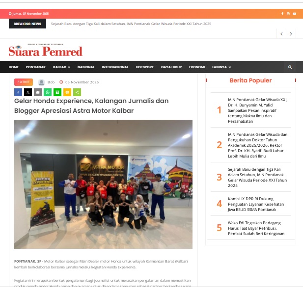 Gelar Honda Experience, Kalangan Jurnalis dan Blogger Apresiasi Astra Motor Kalbar by masmul 5 November 2025 in Silahkan kunjungi https://www.suarapemredkalbar.com/read/potret/05112025/gelar-honda-experience-kalangan-jurnalis-dan-blogger-apresiasi-astra-motor-kalbar. You Might Like Regional Public Launching New ADV160 The SUV Pride Grand Launching New PCX 160 Truly Exceptional! Tetap hati-hati ya bro sist berkendara saat hujan.