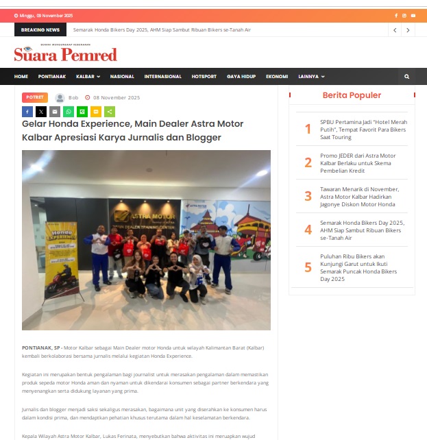 Gelar Honda Experience, Main Dealer Astra Motor Kalbar Apresiasi Karya Jurnalis dan Blogger by masmul 8 November 2025 in Silahkan kunjungi https://www.suarapemredkalbar.com/read/potret/08112025/gelar-honda-experience-main-dealer-astra-motor-kalbar-apresiasi-karya-jurnalis-dan-blogger. You Might Like Regional Public Launching New ADV160 The SUV Pride Grand Launching New PCX 160 Truly Exceptional! Tetap hati-hati ya bro sist berkendara saat hujan.