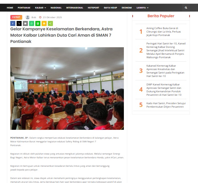 Gelar Kampanye Keselamatan Berkendara, Astra Motor Kalbar Lahirkan Duta Cari Aman di SMAN 7 Pontianak by masmul 23 Oktober 2025 in Silahkan kunjungi https://www.suarapemredkalbar.com/read/potret/23102025/gelar-kampanye-keselamatan-berkendara-astra-motor-kalbar-lahirkan-duta-cari-aman-di-sman-7-pontianak. You Might Like Regional Public Launching New ADV160 The SUV Pride Grand Launching New PCX 160 Truly Exceptional! Tetap hati-hati ya bro sist berkendara saat hujan.