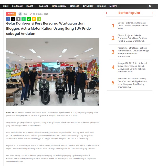 Gelar Konferensi Pers Bersama Wartawan dan Blogger, Astra Motor Kalbar Usung Sang SUV Pride sebagai Andalan by masmul 18 Oktober 2025 in Silahkan kunjungi https://www.suarapemredkalbar.com/read/potret/18102025/gelar-konferensi-pers-bersama-wartawan-dan-blogger-astra-motor-kalbar-usung-sang-suv-pride-sebagai-andalan. You Might Like Regional Public Launching New ADV160 The SUV Pride Grand Launching New PCX 160 Truly Exceptional! Tetap hati-hati ya bro sist berkendara saat hujan.