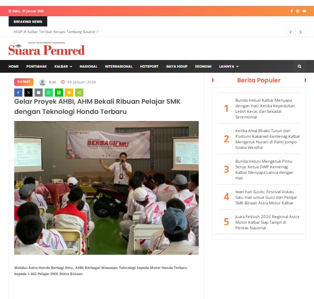 Gelar Proyek AHBI, AHM Bekali Ribuan Pelajar SMK dengan Teknologi Honda Terbaru by masmul 4 Januari 2026 in Silahkan kunjungi https://www.suarapemredkalbar.com/read/potret/04012026/gelar-proyek-ahbi-ahm-bekali-ribuan-pelajar-smk-dengan-teknologi-honda-terbaru. You Might Like Regional Public Launching New ADV160 The SUV Pride Grand Launching New PCX 160 Truly Exceptional! Tetap hati-hati ya bro sist berkendara saat hujan.
