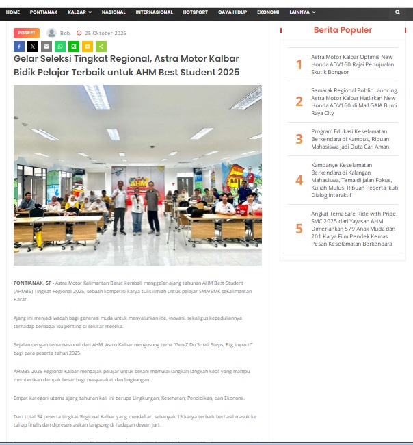 Gelar Seleksi Tingkat Regional, Astra Motor Kalbar Bidik Pelajar Terbaik untuk AHM Best Student 2025 by masmul 25 Oktober 2025 in Silahkan kunjungi https://www.suarapemredkalbar.com/read/potret/25102025/gelar-seleksi-tingkat-regional-astra-motor-kalbar-bidik-pelajar-terbaik-untuk-ahm-best-student-2025. You Might Like Regional Public Launching New ADV160 The SUV Pride Grand Launching New PCX 160 Truly Exceptional! Tetap hati-hati ya bro sist berkendara saat hujan.