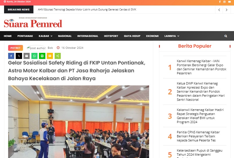 Gelar Sosialisai Safety Riding di FKIP Untan Pontianak, Astra Motor Kalbar dan PT Jasa Raharja Jelaskan Bahaya Kecelakaan di Jalan Raya by masmul 16 Oktober 2024 in Silahkan kunjungi https://www.suarapemredkalbar.com/read/potret/16102024/gelar-sosialisai-safety-riding-di-fkip-untan-pontianak-astra-motor-kalbar-dan-pt-jasa-raharja-jelaskan-bahaya-kecelakaan-di-jalan-raya. You Might Like Regional Public Launching New ADV160 The SUV Pride Grand Launching New PCX 160 Truly Exceptional! Tetap hati-hati ya bro sist berkendara saat hujan.