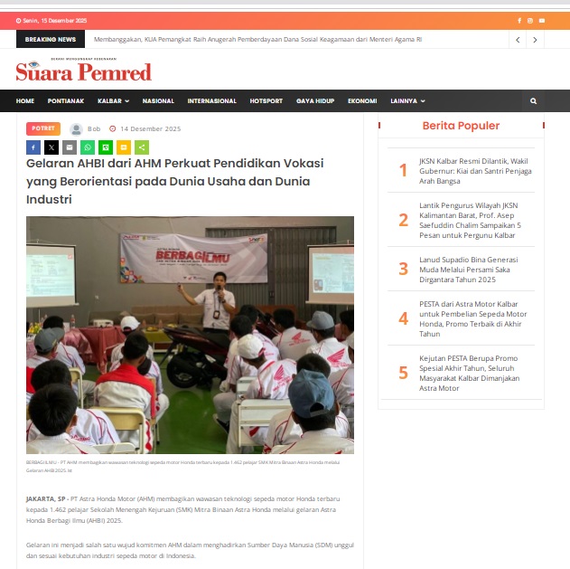 Gelaran AHBI dari AHM Perkuat Pendidikan Vokasi yang Berorientasi pada Dunia Usaha dan Dunia Industri by masmul 14 Desember 2025 in Silahkan kunjungi https://www.suarapemredkalbar.com/read/potret/14122025/gelaran-ahbi-dari-ahm-perkuat-pendidikan-vokasi-yang-berorientasi-pada-dunia-usaha-dan-dunia-industri. You Might Like Regional Public Launching New ADV160 The SUV Pride Grand Launching New PCX 160 Truly Exceptional! Tetap hati-hati ya bro sist berkendara saat hujan.