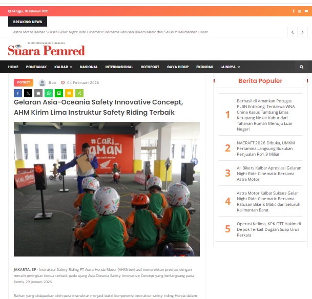 Gelaran Asia-Oceania Safety Innovative Concept, AHM Kirim Lima Instruktur Safety Riding Terbaik by masmul 4 Februari 2026 in Silahkan kunjungi https://www.suarapemredkalbar.com/read/potret/04022026/gelaran-asia-oceania-safety-innovative-concept-ahm-kirim-lima-instruktur-safety-riding-terbaik. You Might Like Regional Public Launching New ADV160 The SUV Pride Grand Launching New PCX 160 Truly Exceptional! Tetap hati-hati ya bro sist berkendara saat hujan.