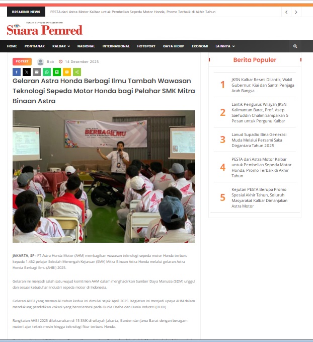 Gelaran Astra Honda Berbagi Ilmu Tambah Wawasan Teknologi Sepeda Motor Honda bagi Pelahar SMK Mitra Binaan Astra by masmul 14 Desember 2025 in Silahkan kunjungi https://www.suarapemredkalbar.com/read/potret/14122025/gelaran-astra-honda-berbagi-ilmu-tambah-wawasan-teknologi-sepeda-motor-honda-bagi-pelahar-smk-mitra-binaan-astra. You Might Like Regional Public Launching New ADV160 The SUV Pride Grand Launching New PCX 160 Truly Exceptional! Tetap hati-hati ya bro sist berkendara saat hujan.