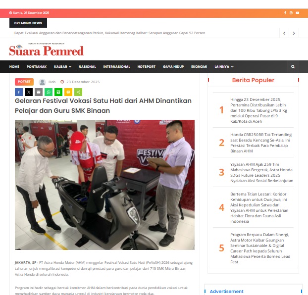 Gelaran Festival Vokasi Satu Hati dari AHM Dinantikan Pelajar dan Guru SMK Binaan by masmul 23 Desember 2025 in Silahkan kunjungi https://www.suarapemredkalbar.com/read/potret/23122025/gelaran-festival-vokasi-satu-hati-dari-ahm-dinantikan-pelajar-dan-guru-smk-binaan. You Might Like Regional Public Launching New ADV160 The SUV Pride Grand Launching New PCX 160 Truly Exceptional! Tetap hati-hati ya bro sist berkendara saat hujan.
