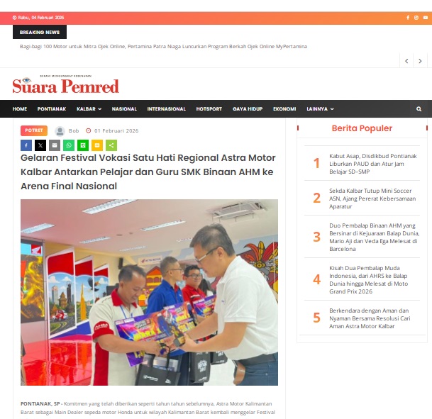 Gelaran Festival Vokasi Satu Hati Regional Astra Motor Kalbar Antarkan Pelajar dan Guru SMK Binaan AHM ke Arena Final Nasional by masmul 1 Februari 2026 in Silahkan kunjungi https://www.suarapemredkalbar.com/read/potret/01022026/gelaran-festival-vokasi-satu-hati-regional-astra-motor-kalbar-antarkan-pelajar-dan-guru-smk-binaan-ahmke-arena-final-nasional. You Might Like Regional Public Launching New ADV160 The SUV Pride Grand Launching New PCX 160 Truly Exceptional! Tetap hati-hati ya bro sist berkendara saat hujan.