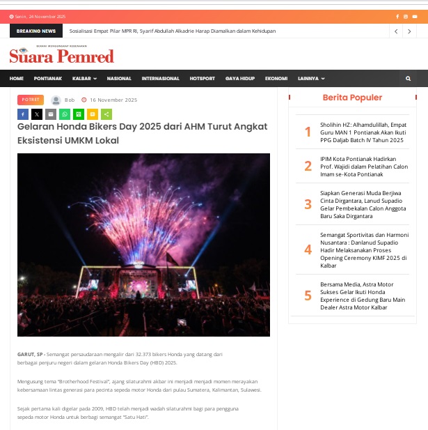 Gelaran Honda Bikers Day 2025 dari AHM Turut Angkat Eksistensi UMKM Lokal by masmul 16 November 2025 in Silahkan kunjungi https://www.suarapemredkalbar.com/read/potret/16112025/gelaran-honda-bikers-day-2025-dari-ahm-turut-angkat-eksistensi-umkm-lokal. You Might Like Regional Public Launching New ADV160 The SUV Pride Grand Launching New PCX 160 Truly Exceptional! Tetap hati-hati ya bro sist berkendara saat hujan.