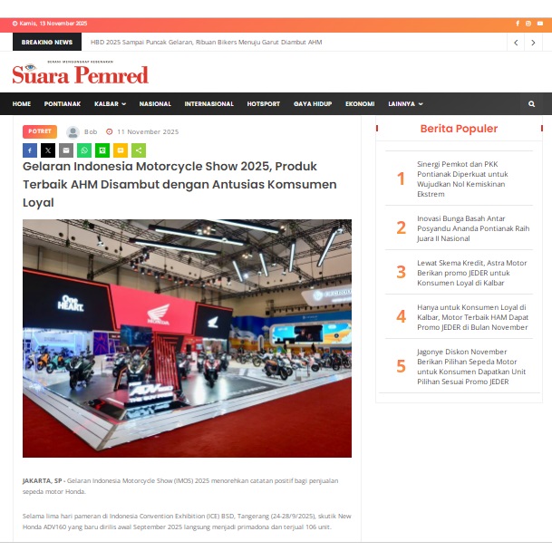 Gelaran Indonesia Motorcycle Show 2025, Produk Terbaik AHM Disambut dengan Antusias Komsumen Loyal by masmul 11 November 2025 in Silahkan kunjungi https://www.suarapemredkalbar.com/read/potret/11112025/gelaran-indonesia-motorcycle-show-2025-produk-terbaik-ahm-disambut-dengan-antusias-komsumen-loyal. You Might Like Regional Public Launching New ADV160 The SUV Pride Grand Launching New PCX 160 Truly Exceptional! Tetap hati-hati ya bro sist berkendara saat hujan.