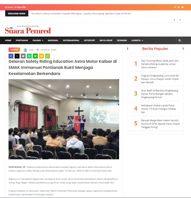 Gelaran Safety Riding Education Astra Motor Kalbar di SMAK Immanuel Pontianak Bukti Menjaga Keselamatan Berkendara by masmul 18 Maret 2026 in Silahkan kunjungi https://www.suarapemredkalbar.com/read/potret/18032026/gelaran-safety-riding-education-astra-motor-kalbar-di-smak-immanuel-pontianakbukti-menjaga-keselamatan-berkendara. You Might Like Regional Public Launching New ADV160 The SUV Pride Grand Launching New PCX 160 Truly Exceptional! Tetap hati-hati ya bro sist berkendara saat hujan.