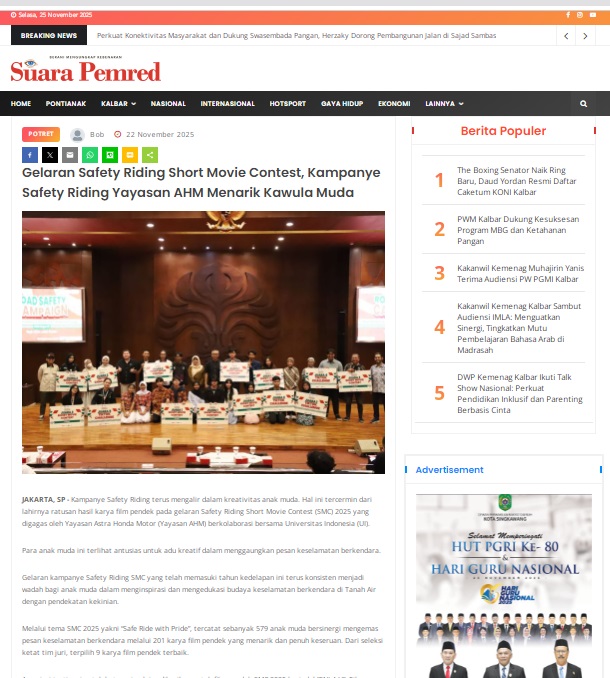 Gelaran Safety Riding Short Movie Contest, Kampanye Safety Riding Yayasan AHM Menarik Kawula Muda by masmul 22 November 2025 in Silahkan kunjungi https://www.suarapemredkalbar.com/read/potret/22112025/gelaran-safety-riding-short-movie-contest-kampanye-safety-riding-yayasan-ahm-menarik-kawula-muda. You Might Like Regional Public Launching New ADV160 The SUV Pride Grand Launching New PCX 160 Truly Exceptional! Tetap hati-hati ya bro sist berkendara saat hujan.