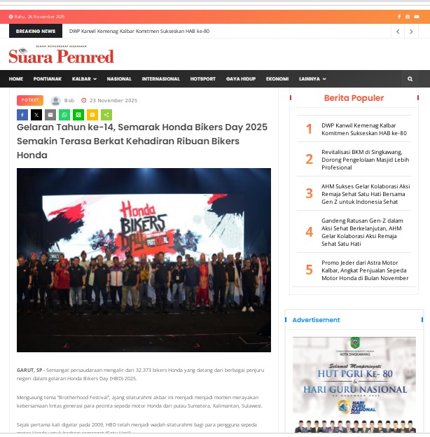 Gelaran Tahun ke-14, Semarak Honda Bikers Day 2025 Semakin Terasa Berkat Kehadiran Ribuan Bikers Honda by masmul 23 November 2025 in Silahkan kunjungi https://www.suarapemredkalbar.com/read/potret/23112025/gelaran-tahun-ke-14-semarak-honda-bikers-day-2025-semakin-terasa-berkat-kehadiran-ribuan-bikers-honda. You Might Like Regional Public Launching New ADV160 The SUV Pride Grand Launching New PCX 160 Truly Exceptional! Tetap hati-hati ya bro sist berkendara saat hujan.