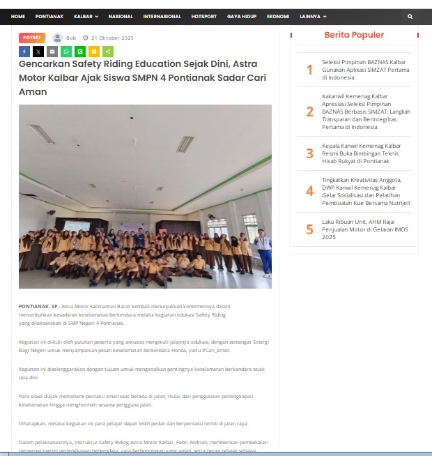 Gencarkan Safety Riding Education Sejak Dini, Astra Motor Kalbar Ajak Siswa SMPN 4 Pontianak Sadar Cari Aman by masmul 21 Oktober 2025 in Silahkan kunjungi https://www.suarapemredkalbar.com/read/potret/21102025/gencarkan-safety-riding-education-sejak-dini-astra-motor-kalbar-ajak-siswa-smpn-4-pontianak-sadar-cari-aman. You Might Like Regional Public Launching New ADV160 The SUV Pride Grand Launching New PCX 160 Truly Exceptional! Tetap hati-hati ya bro sist berkendara saat hujan.