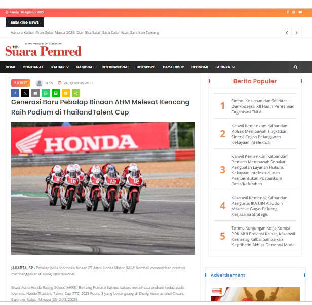 Generasi Baru Pebalap Binaan AHM Melesat Kencang Raih Podium di ThailandTalent Cup by masmul 26 Agustus 2025 in Silahkan kunjungi https://www.suarapemredkalbar.com/read/potret/26082025/generasi-baru-pebalap-binaan-ahm-melesat-kencang-raih-podium-di-thailandtalent-cup. You Might Like Regional Public Launching New ADV160 The SUV Pride Grand Launching New PCX 160 Truly Exceptional! Tetap hati-hati ya bro sist berkendara saat hujan.
