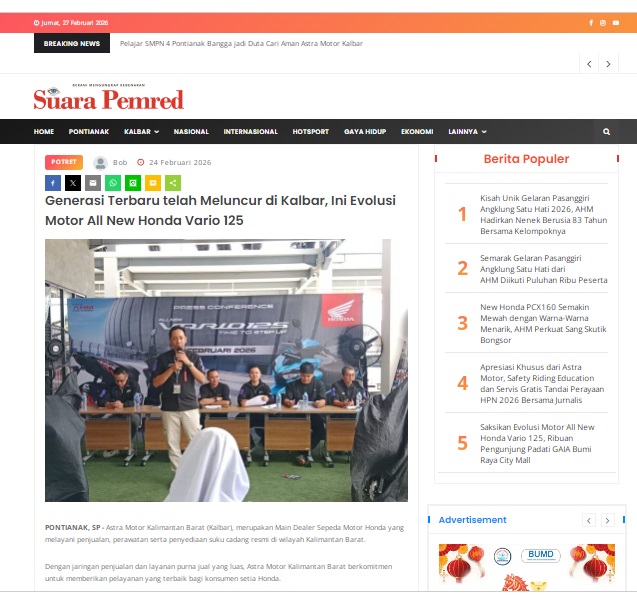 Generasi Terbaru telah Meluncur di Kalbar, Ini Evolusi Motor All New Honda Vario 125 by masmul 24 Februari 2026 in Silahkan kunjungi https://www.suarapemredkalbar.com/read/potret/24022026/generasi-terbaru-telah-meluncur-di-kalbar-ini-evolusi-motor-all-new-honda-vario-125. You Might Like Regional Public Launching New ADV160 The SUV Pride Grand Launching New PCX 160 Truly Exceptional! Tetap hati-hati ya bro sist berkendara saat hujan.