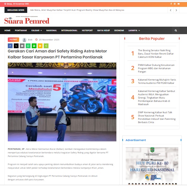 Gerakan Cari Aman dari Safety Riding Astra Motor Kalbar Sasar Karyawan PT Pertamina Pontianak by masmul 20 November 2025 in Silahkan kunjungi https://www.suarapemredkalbar.com/read/potret/20112025/gerakan-cari-aman-dari-safety-riding-astra-motor-kalbar-sasar-karyawan-pt-pertamina-pontianak. You Might Like Regional Public Launching New ADV160 The SUV Pride Grand Launching New PCX 160 Truly Exceptional! Tetap hati-hati ya bro sist berkendara saat hujan.