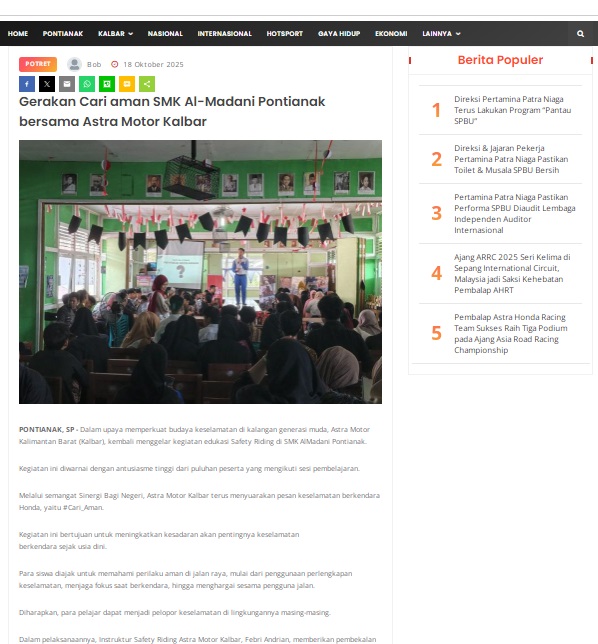 Gerakan Cari aman SMK Al-Madani Pontianak bersama Astra Motor Kalbar by masmul 18 Oktober 2025 in Silahkan kunjungi https://www.suarapemredkalbar.com/read/potret/18102025/gerakan-cari-aman-smk-al-madani-pontianak-bersama-astra-motor-kalbar. You Might Like Regional Public Launching New ADV160 The SUV Pride Grand Launching New PCX 160 Truly Exceptional! Tetap hati-hati ya bro sist berkendara saat hujan.