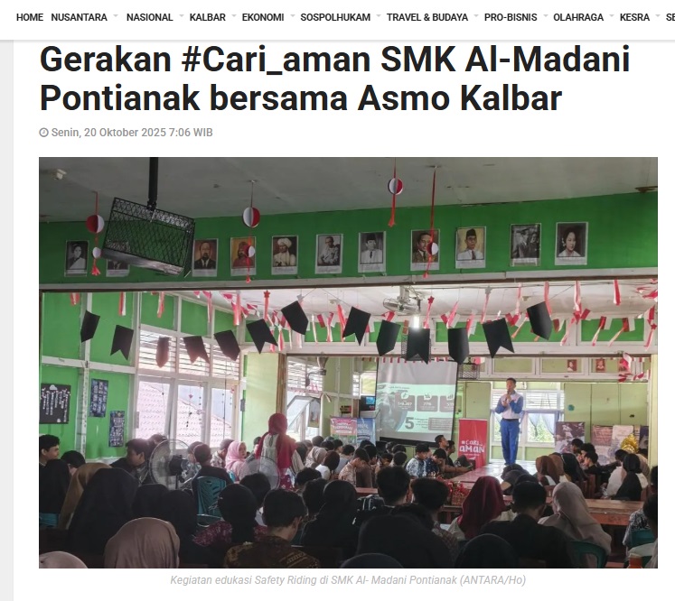 Gerakan #Cari_aman SMK Al-Madani Pontianak bersama Asmo Kalbar by Dedi 20 Oktober 2025 in Silahkan kunjungi https://kalbar.antaranews.com/berita/670237/gerakan-cari-aman-smk-al-madani-pontianak-bersama-asmo-kalbar. You Might Like Regional Public Launching New ADV160 The SUV Pride Grand Launching New PCX 160 Truly Exceptional! Tetap hati-hati ya bro sist berkendara saat hujan.