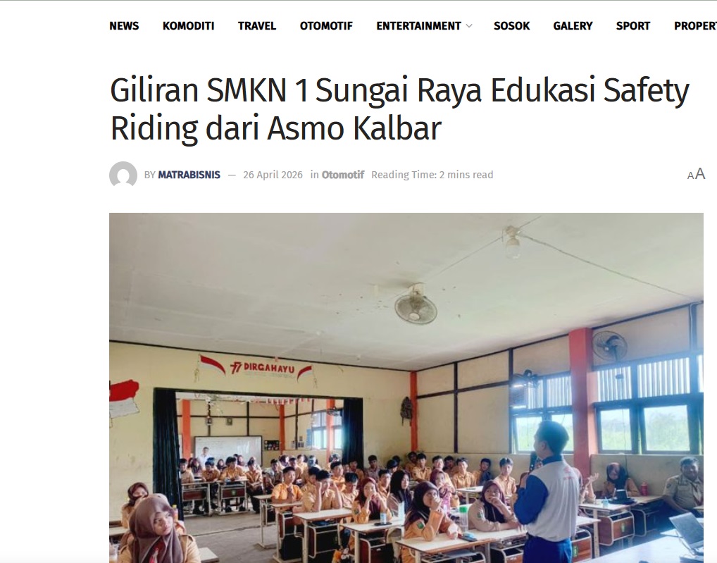 Giliran SMKN 1 Sungai Raya Edukasi Safety Riding dari Asmo Kalbar by Sri Yuliantiningsih 26 April 2026 in Silahkan kunjungi https://matrabisnis.id/2026/04/26/giliran-smkn-1-sungai-raya-edukasi-safety-riding-dari-asmo-kalbar/. You Might Like Regional Public Launching New ADV160 The SUV Pride Grand Launching New PCX 160 Truly Exceptional! Tetap hati-hati ya bro sist berkendara saat hujan.