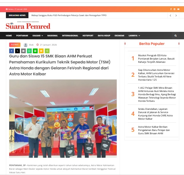Guru dan Siswa 15 SMK Biaan AHM Perkuat Pemahaman Kurikulum Teknik Sepeda Motor (TSM) Astra Honda dengan Gelaran FeVosh Regional dari Astra Motor Kalbar by masmul 21 Januari 2026 in Silahkan kunjungi https://www.suarapemredkalbar.com/read/potret/21012026/guru-dan-siswa-15-smk-biaan-ahm-perkuat-pemahaman-kurikulum-teknik-sepeda-motor-tsm-astra-honda-dengan-gelaran-fevosh-regional-dari-astra-motor-kalbar. You Might Like Regional Public Launching New ADV160 The SUV Pride Grand Launching New PCX 160 Truly Exceptional! Tetap hati-hati ya bro sist berkendara saat hujan.