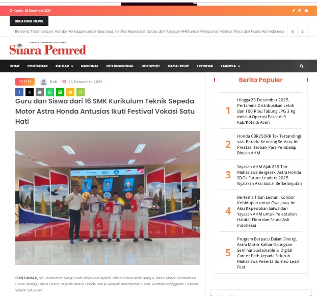 Guru dan Siswa dari 16 SMK Kurikulum Teknik Sepeda Motor Astra Honda Antusias Ikuti Festival Vokasi Satu Hati by masmul 23 Desember 2025 in Silahkan kunjungi https://www.suarapemredkalbar.com/read/potret/23122025/guru-dan-siswa-dari-16-smk-kurikulum-teknik-sepeda-motor-astra-honda-antusias-ikuti-festival-vokasi-satu-hati. You Might Like Regional Public Launching New ADV160 The SUV Pride Grand Launching New PCX 160 Truly Exceptional! Tetap hati-hati ya bro sist berkendara saat hujan.