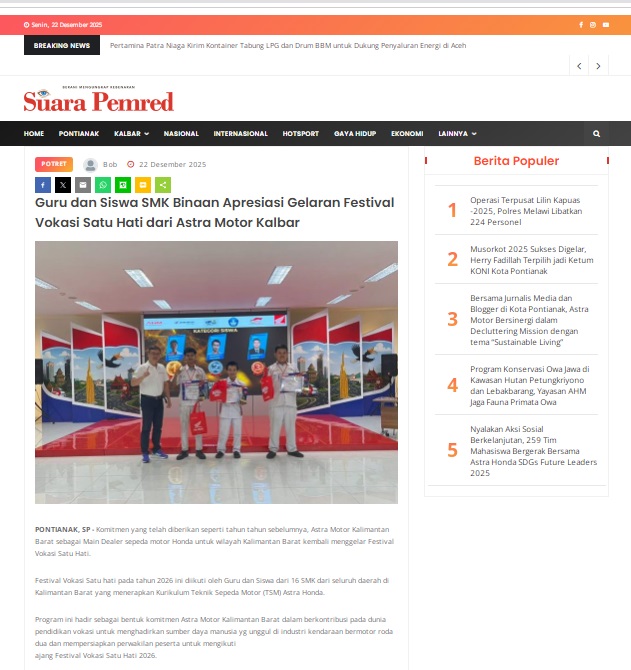 Guru dan Siswa SMK Binaan Apresiasi Gelaran Festival Vokasi Satu Hati dari Astra Motor Kalbar by masmul 22 Desember 2025 in Silahkan kunjungi https://www.suarapemredkalbar.com/read/potret/22122025/guru-dan-siswa-smk-binaan-apresiasi-gelaran-festival-vokasi-satu-hati-dari-astra-motor-kalbar. You Might Like Regional Public Launching New ADV160 The SUV Pride Grand Launching New PCX 160 Truly Exceptional! Tetap hati-hati ya bro sist berkendara saat hujan.