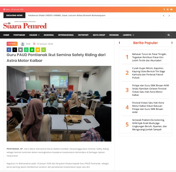 Guru PAUD Pontianak ikut Semina Safety Riding dari Astra Motor Kalbar by masmul 23 Januari 2026 in Silahkan kunjungi https://www.suarapemredkalbar.com/read/potret/23012026/guru-paud-pontianak-ikut-semina-safety-riding-dari-astra-motor-kalbar. You Might Like Regional Public Launching New ADV160 The SUV Pride Grand Launching New PCX 160 Truly Exceptional! Tetap hati-hati ya bro sist berkendara saat hujan.