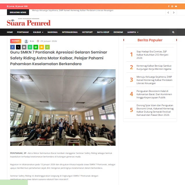 Guru SMKN 7 Pontianak Apresiasi Gelaran Seminar Safety Riding Astra Motor Kalbar, Pelajar Pahami Pahamkan Keselamatan Berkendara by masmul 29 Januari 2026 in Silahkan kunjungi https://www.suarapemredkalbar.com/read/potret/29012026/guru-smkn-7-pontianak-apresiasi-gelaran-seminar-safety-riding-astra-motor-kalbar-pelajar-pahami-pahamkan-keselamatan-berkendara. You Might Like Regional Public Launching New ADV160 The SUV Pride Grand Launching New PCX 160 Truly Exceptional! Tetap hati-hati ya bro sist berkendara saat hujan.