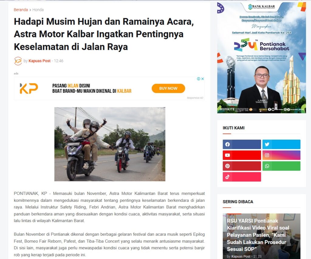 Hadapi Musim Hujan dan Ramainya Acara, Astra Motor Kalbar Ingatkan Pentingnya Keselamatan di Jalan Raya by Muhammad Arif 25 Oktober 2025 in Silahkan kunjungi https://www.kapuaspost.web.id/2025/10/hadapi-musim-hujan-dan-ramainya-acara.html. Tags: astra Astra Motor kalbar Astra Motor Pontianak astramotor honda kalbar pontianak sepeda motor You Might Like Regional Public Launching New ADV160 The SUV Pride Grand Launching New PCX 160 Truly Exceptional! Tetap hati-hati ya bro sist berkendara saat hujan.
