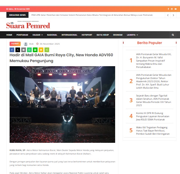 Hadir di Mall GAIA Bumi Raya City, New Honda ADV160 Memukau Pengunjung by masmul 6 November 2025 in Silahkan kunjungi https://www.suarapemredkalbar.com/read/potret/06112025/hadir-di-mall-gaia-bumi-raya-city-new-honda-adv160-memukau-pengunjung. You Might Like Regional Public Launching New ADV160 The SUV Pride Grand Launching New PCX 160 Truly Exceptional! Tetap hati-hati ya bro sist berkendara saat hujan.