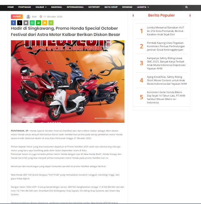 Hadir di Singkawang, Promo Honda Special October Festival dari Astra Motor Kalbar Berikan Diskon Besar by masmul 11 Oktober 2025 in Silahkan kunjungi https://www.suarapemredkalbar.com/read/potret/11102025/hadir-di-singkawang-promo-honda-special-october-festival-dari-astra-motor-kalbar-berikan-diskon-besar. You Might Like Regional Public Launching New ADV160 The SUV Pride Grand Launching New PCX 160 Truly Exceptional! Tetap hati-hati ya bro sist berkendara saat hujan.