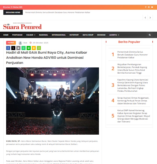 Hadiri di Mall GAIA Bumi Raya City, Asmo Kalbar Andalkan New Honda ADV160 untuk Dominasi Penjualan by masmul 29 Oktober 2025 in Silahkan kunjungi https://www.suarapemredkalbar.com/read/potret/29102025/hadiri-di-mall-gaia-bumi-raya-city-asmo-kalbar-andalkan-new-honda-adv160-untuk-dominasi-penjualan. You Might Like Regional Public Launching New ADV160 The SUV Pride Grand Launching New PCX 160 Truly Exceptional! Tetap hati-hati ya bro sist berkendara saat hujan.