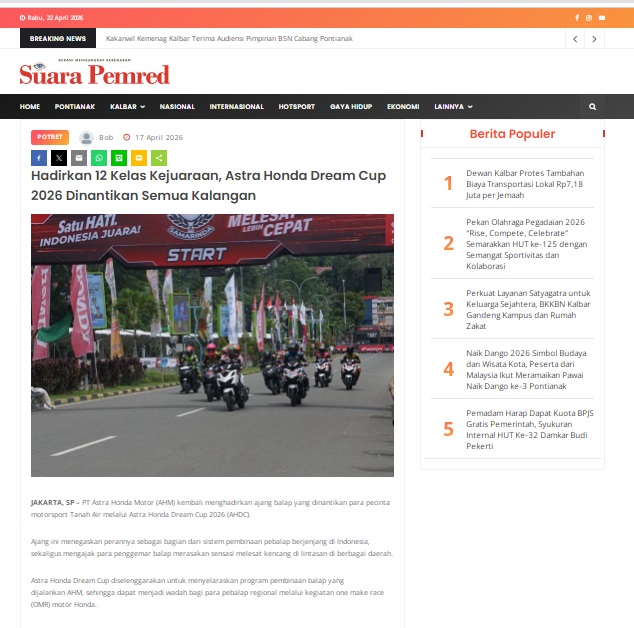 Hadirkan 12 Kelas Kejuaraan, Astra Honda Dream Cup 2026 Dinantikan Semua Kalangan by masmul 17 April 2026 in Silahkan kunjungi https://www.suarapemredkalbar.com/read/potret/17042026/hadirkan-12-kelas-kejuaraan-astra-honda-dream-cup-2026-dinantikan-semua-kalangan. You Might Like Regional Public Launching New ADV160 The SUV Pride Grand Launching New PCX 160 Truly Exceptional! Tetap hati-hati ya bro sist berkendara saat hujan.